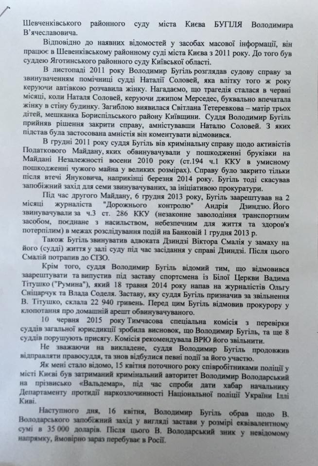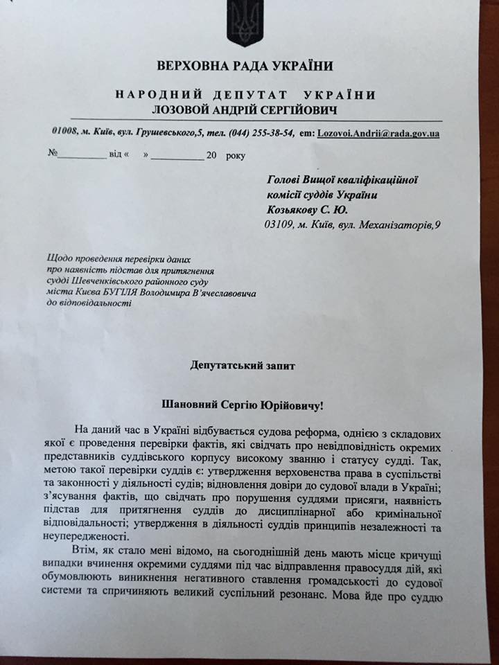 Як і обіцяв на ефірі NewsOne TV, звернувся із депутатським запитом до Голови Вищої кваліфікаційної комісії суддів Сергія Козькова з вимогою провести перевірку судді Володимира Бугіля і притягнути його до відповідальності.