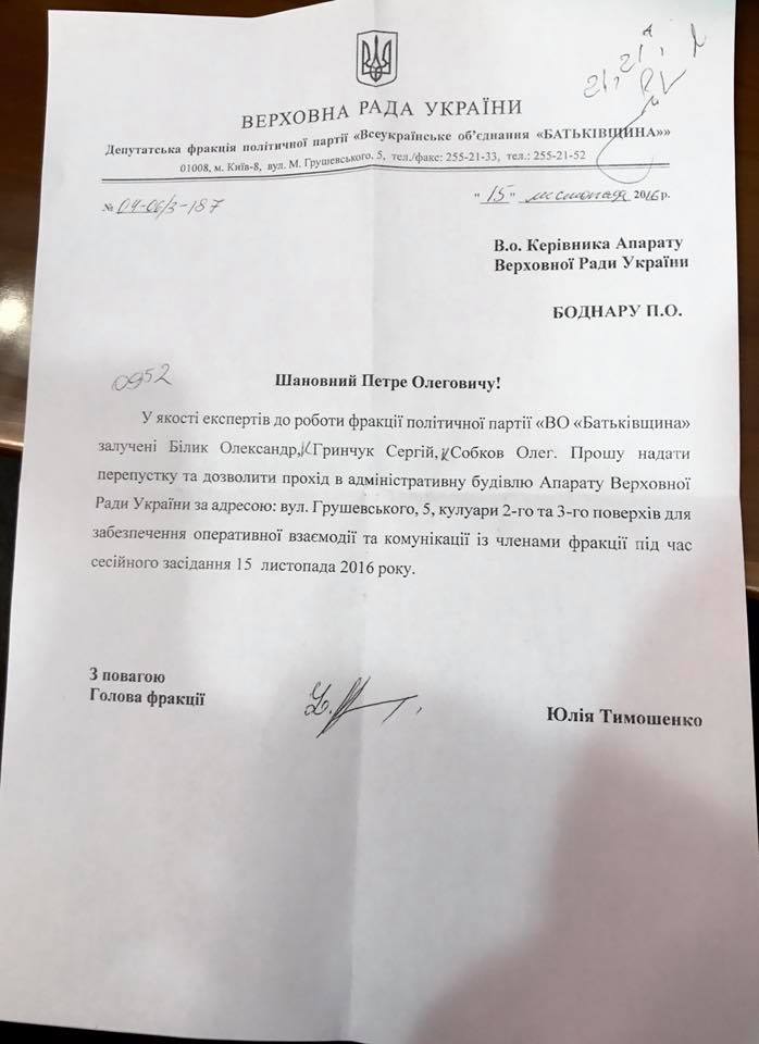 Копія документу на підтвердження того, що за зверненням особисто Юлії Тимошенко серед інших зміг потрапити у кулуари парламенту і охоронець Медведчука Олександр Білик.