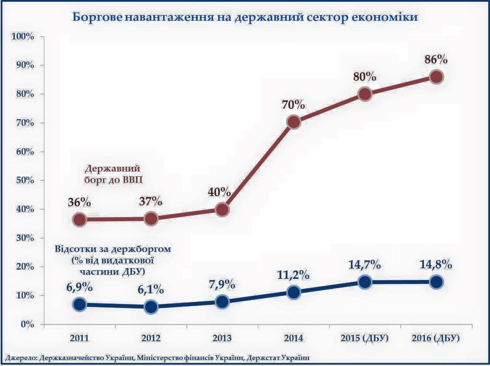 Реструктуризація держборгу ніби то була проведена у 2015 році. Але де ж зменшення навантаження держборгу на економіку та бюджетних витрат на сплату відсотків? На кінець листопада 2015 року держборг до ВВП – 80%, а на 2016 рік заплановано вже 86%! Одні тільки відсотки за вже взяті позики (навіть без повернення боргу) - друга найбільша видаткова стаття Держбюджету-2016 - 99,1 млрд грн. Для порівняння в 2015 році ця цифра була на 13 млрд грн меншою - 85 млрд грн.