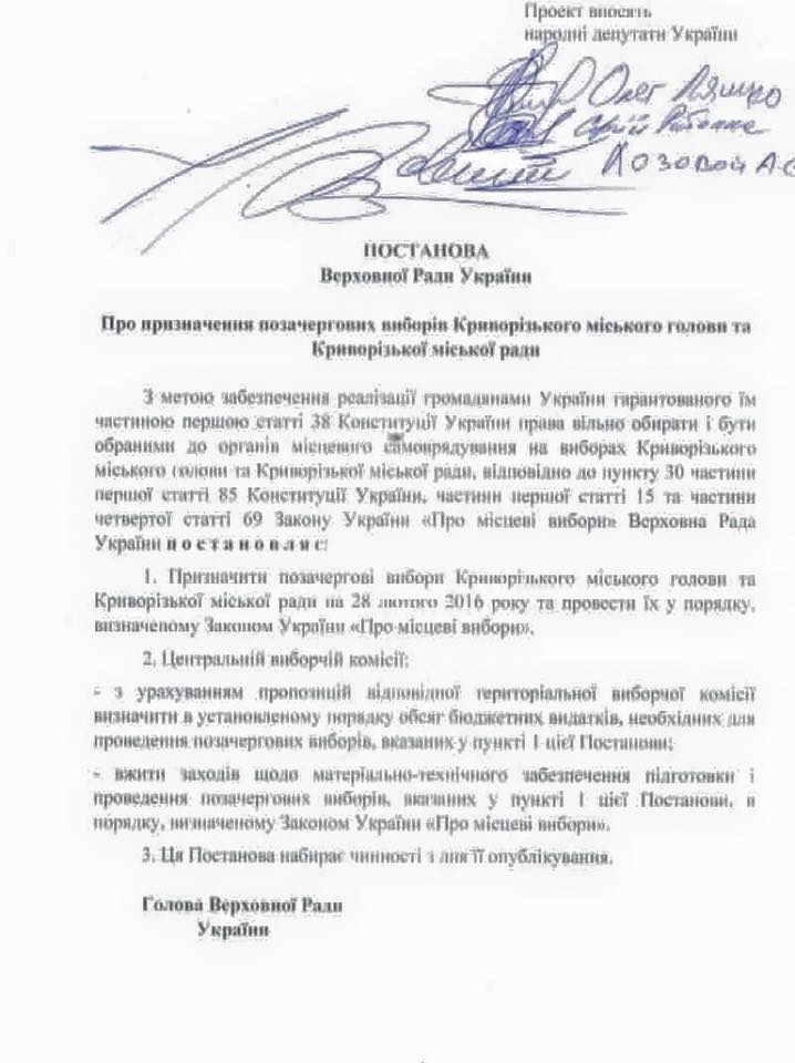 «Метою запропонованого проекту Постанови є відновлення легітимності волевиявлення та захист виборчого права криворіжців на місцевих виборах шляхом призначення позачергових виборів Криворізького міського голови та депутатів Криворізької міської ради на 28 лютого 2016 року», - зазначають автори документу.