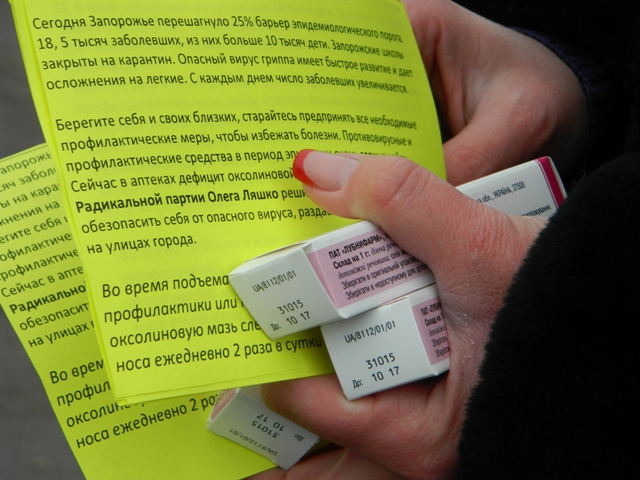Понад 200 запоріжців отримали сьогодні можливіть захиститися від грипу, який поширюється запорізьким регіоном. У той час як на аптечних складах практично вичерпані запаси оксолінової мазі, а поставки профілактичного препарату затримуються, небайдужі до епідеміологічної ситуації в місті, запорізькі члени Радикальної Партії Олега Ляшка  вийшли на допомогу тим, хто обмежений у коштах або в часі та не в силах придбати препарат і вчасно захистити себе від недуги.