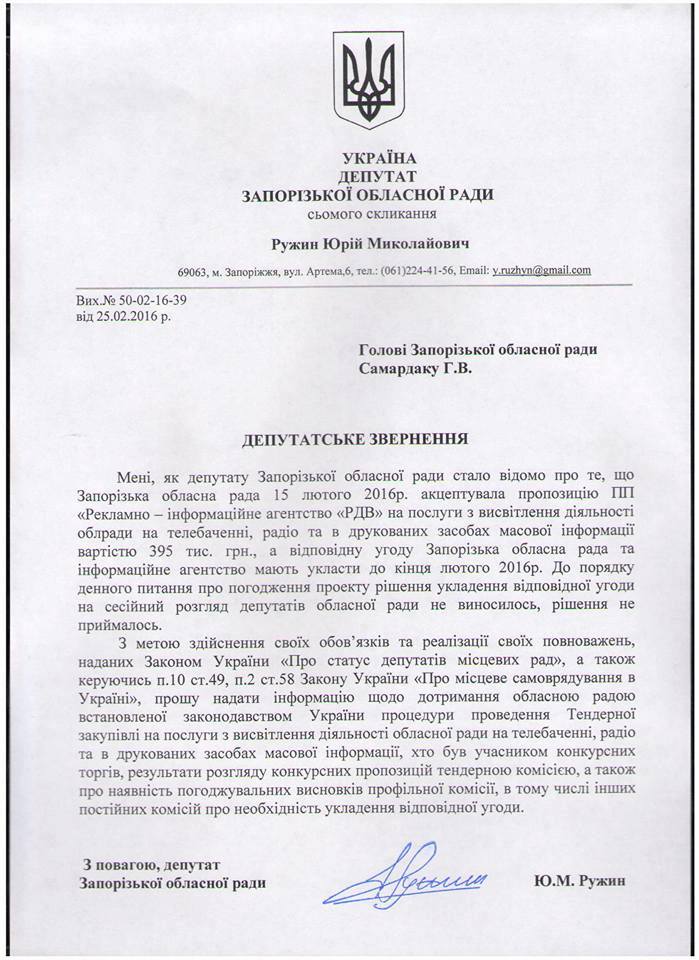 На сесії обласної ради з ініціативи голови фракції Радикальної партії в обласній раді, Юрія Ружина, були подані депутатські запити голові Запорізької обласної ради, Григорію Самардаку, про незаконність проведення тендеру на висвітлення діяльності обласної ради. Зі зрозумілих причин тендер вже в 5-й раз виграє одна і та ж фірма. Згідно «Віснику державних закупівель», Запорізька облрада готова оплатити пропозицію приватного підприємства «Рекламно-інформаційне агентство «РДВ». Йдеться про суму майже 400 тисяч гривень. Залишилися лише формальності та підписання договору. За цю суму приватна фірма повинна забезпечити техзавдання.