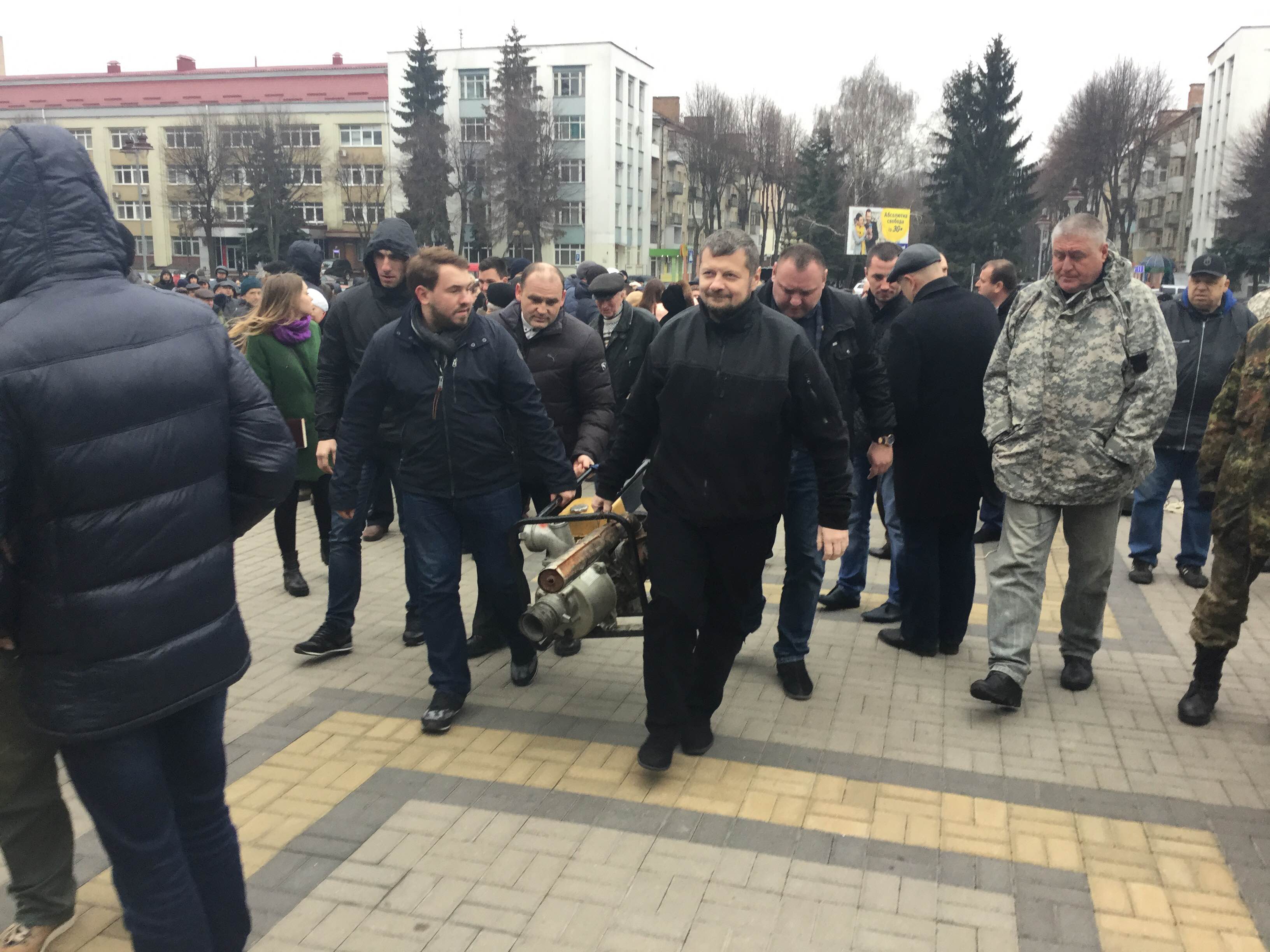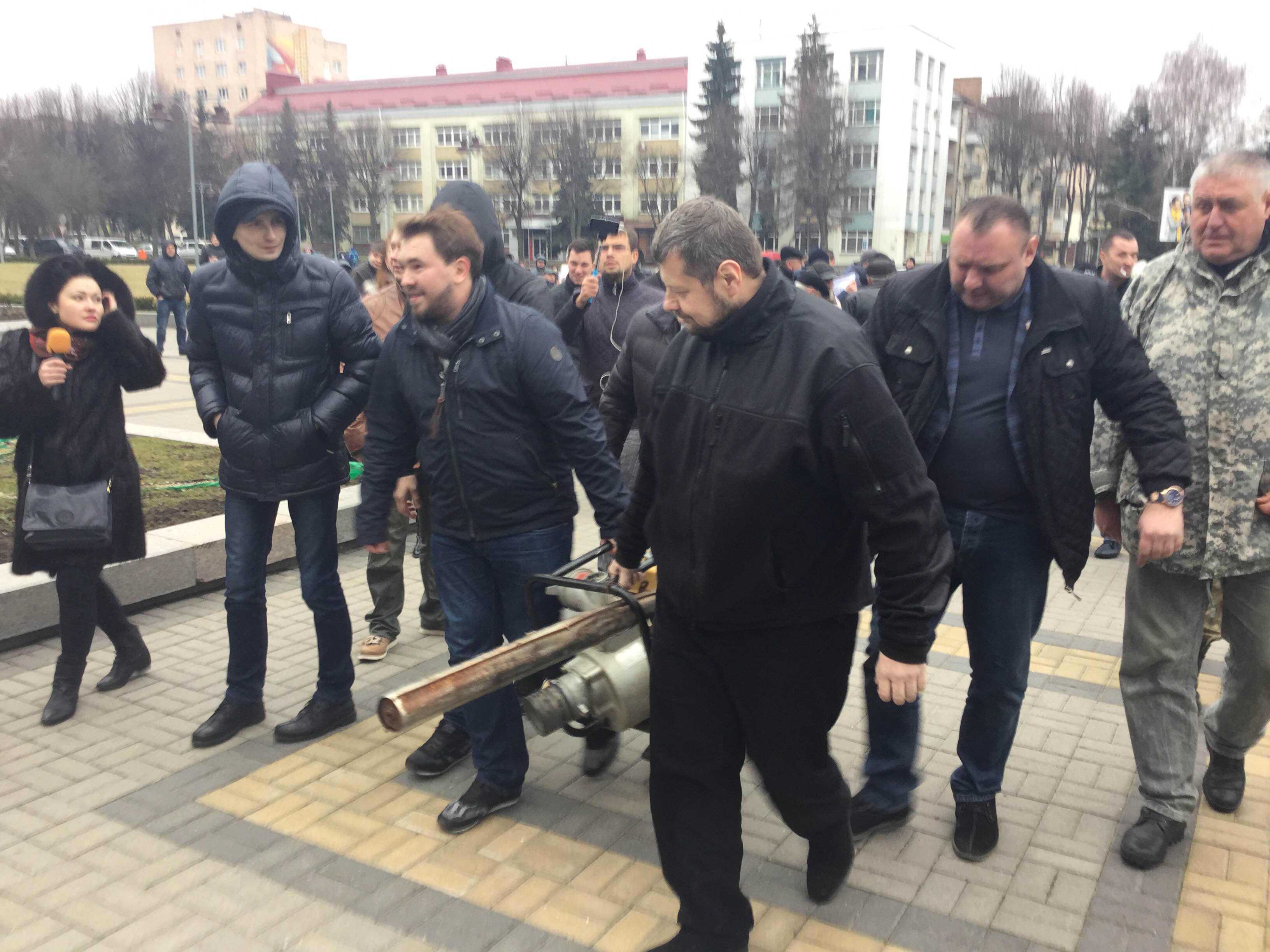 За ініціативою громади, депутати-радикали занесли до кабінету голови ОДА мотопомпу, якою нелегально видобувають бурштин, адже, за їх словами, це єдине чим займається Чугунніков на своїй посаді.