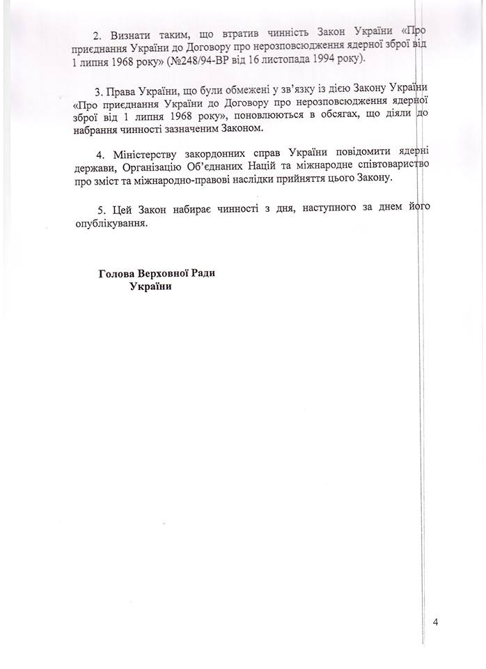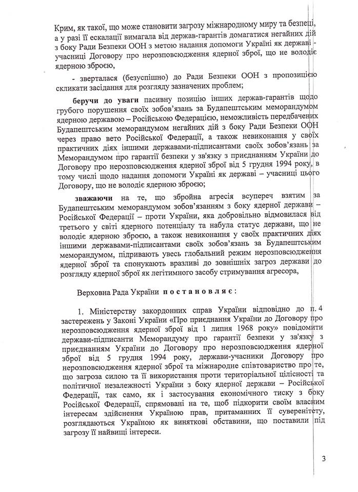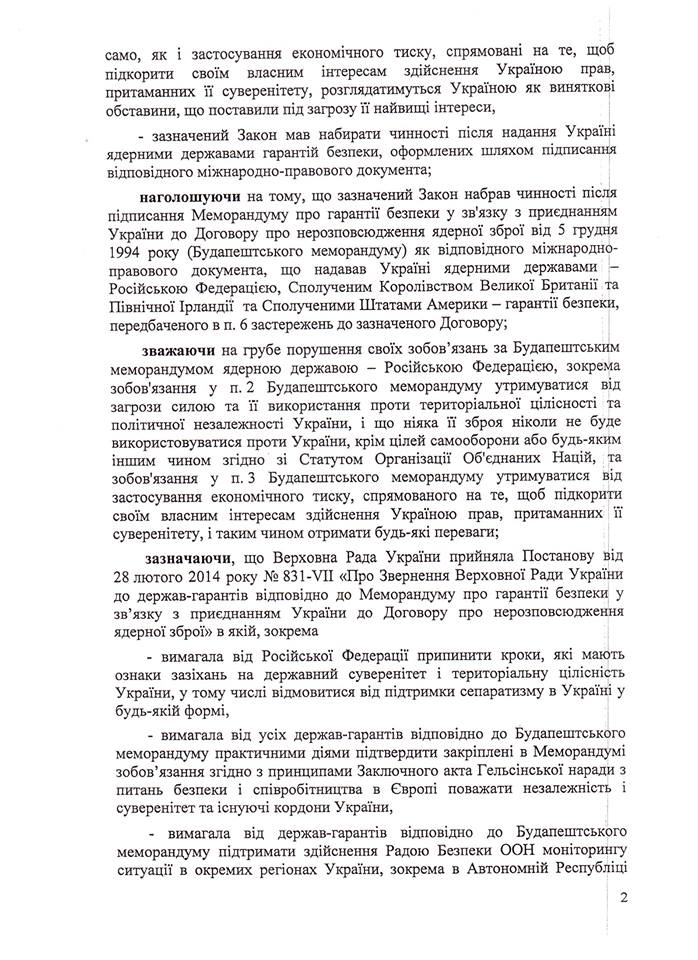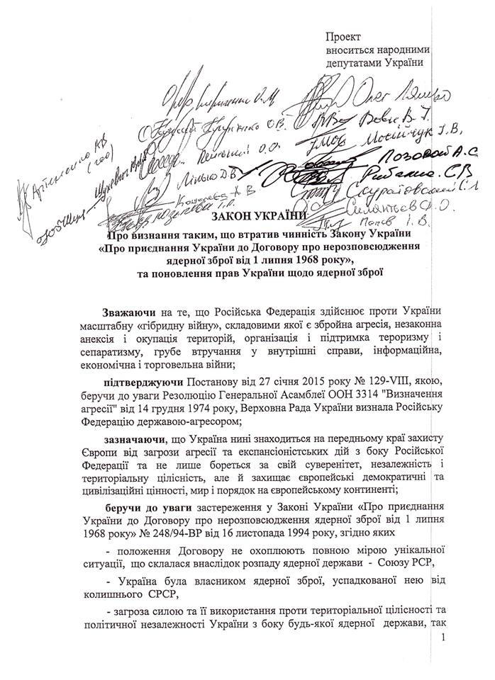 «Грубе порушення своїх зобов’язань за Будапештським меморандумом ядерною державою – Росією та невиконання у своїх практичних діях іншими державами-гарантами – США та Великобританією – своїх зобов’язань за Будапештським меморандумом, тобто недієвість цього меморандуму як належного міжнародно-правового документа відповідного п. 6 застережень до зазначеного Договору, дає можливість Україні прийняти рішення про втрату чинності Закону України «Про приєднання України до Договору про нерозповсюдження ядерної зброї від 1 липня 1968 року», - зазначено у пояснювальній записці до законопроекту.