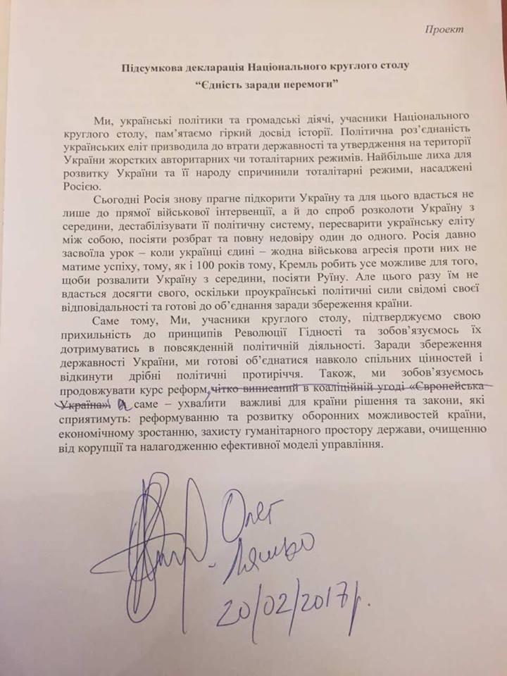 Радикальна партія підтримала декларацію, ухвалену на засіданні Національного круглого столу «Єдність заради перемоги». Документ покликаний розпочати діалог парламентських фракцій заради захисту національних інтересів, особливо на фоні загострення політичного протистояння. Основними засадами декларації лідер фракції РПЛ поділився на своїй сторінці у Facebook.