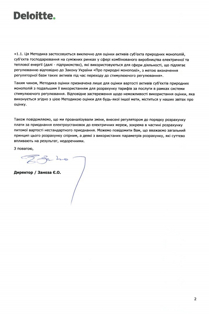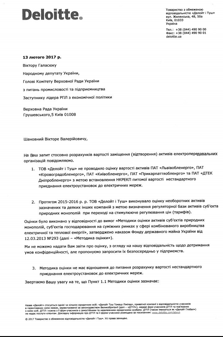 Як раніше повідомлялося, В.Галасюк зробив депутатське звернення до ТОВ «Делойт і Туш», керівництво якого, в свою чергу, поінформувало, що компанія здійснювала оцінку вартості активів суб’єктів природних монополій для цілей інших ніж встановлення вартості нестандартного приєднання, а загальний принцип її розрахунку вважає спірним, а окремі параметри розрахунку, які суттєво впливають на результат, недоречними. Разом з тим, в НКРЕКП посилаються саме на оцінки ТОВ «Делойт і Туш» та ще однієї компанії Big4 при обгрунтуванні нововстановленої вартості нестандартного приєднання до електромереж.