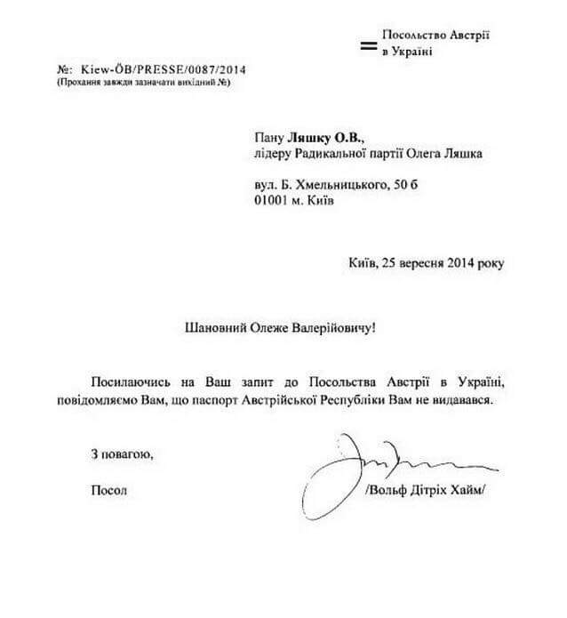 Лідер Радикальної партії опублікував офіційний лист посольства Австрії, в якому спростовується інформація про наявність в нього громадянства цієї країни.