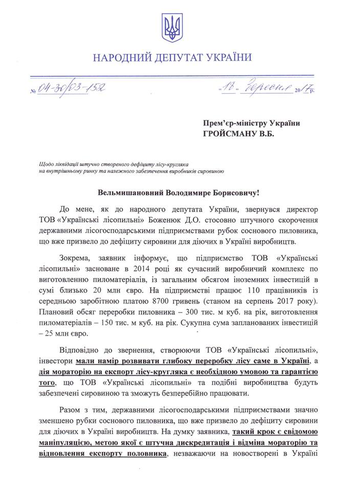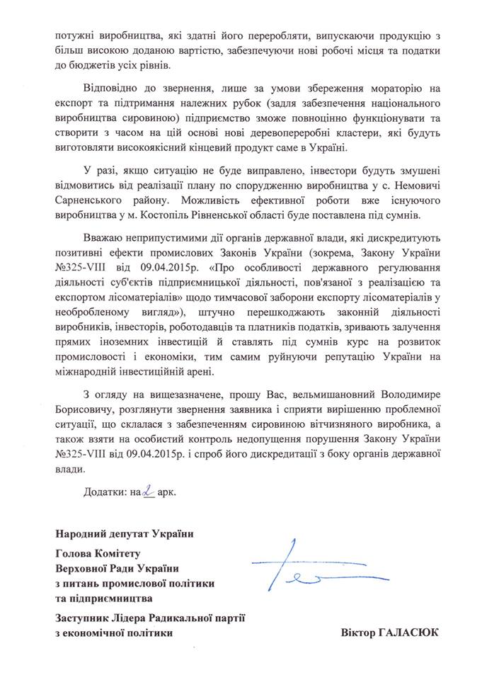 Крім того, В.Галасюк наголосив на штучному створенні органами влади та лісгоспами дефіциту деревини на внутрішньому ринку, «щоб показати мовляв “хоч мораторій і діє, проте проблему гарантованого постачання сировини він не вирішує, тож давайте його відмінимо”: «Заради цього вони здатні залишити одного з найбільших європейських інвесторів в українську деревообробку без сировини! До мене звернувся Йохан Дунбек, той самий шведський інвестор в “Українські лісопильні”, який “з нуля” створив сучасний завод на Рівненщині, інвестувавши 20 млн Євро. Планує вкласти ще 25 млн Євро та запустити ще одне виробництво, але навіть для вже збудованого заводу йому не продають необхідних обсягів сировини».