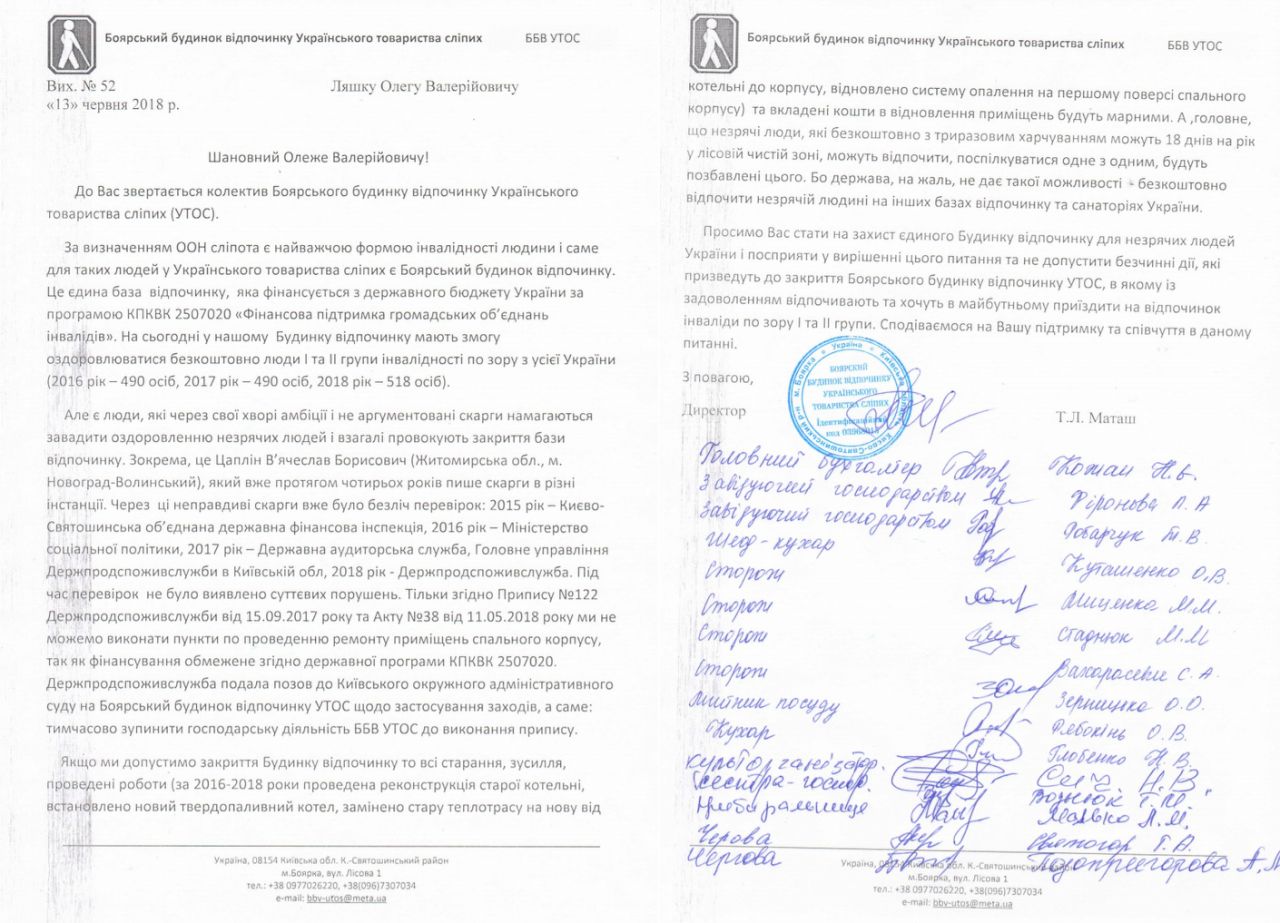 «Просимо Вас стати на захист єдиного Будинку відпочинку для незрячих людей України і посприяти у вирішенні цього питання та не допустити безчинні дії, які призведуть до закриття Боярського будинку відпочинку УТОС, в якому із задоволенням відпочивають та хочуть в майбутньому приїздити на відпочинок люди з інвалідністю по зору І та II групи. Сподіваємося на Вашу підтримку та співчуття в даному питанні», - написали Ляшку працівники бази відпочинку.