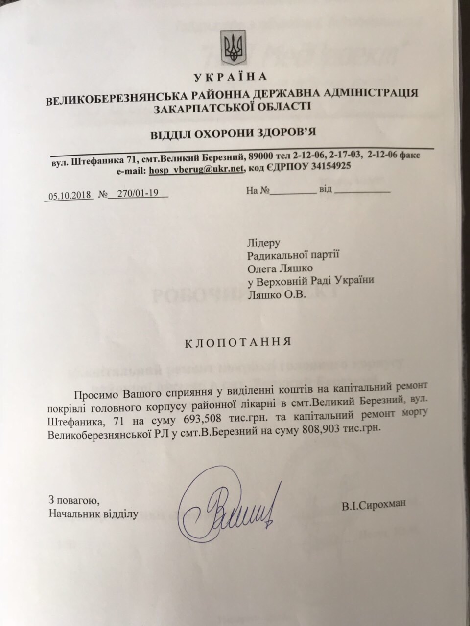 Відповідне клопотання щодо ремонту даху Великоберезнянська РДА спільно із Великоберезнянською районної організацією РПЛ надіслали лідеру Радикальної партії Олегу Ляшку у жовтні цього року.