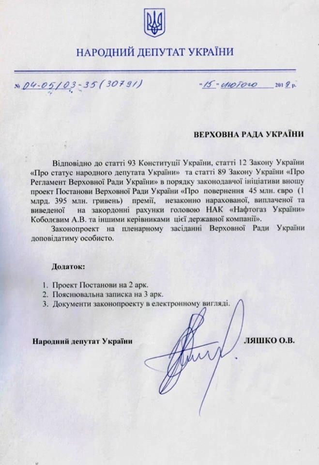 Зобов’язати керівництво «Нафтогазу» повернути до держбюджету 45 млн. євро (1 млрд 395 млн грн) премії, не продовжувати контракт з Андрієм Коболєвим та притягти його до кримінальної відповідальності - вимагає у своєму проекті постанови Олег Ляшко. Політик наголошує: премії за перемогу у Стокгольмському арбітражі у справі проти «Газпрому» керівниками «Нафтогазу» отримані та виведені на закордонні рахунки, хоча ніякої матеріальної компенсації від російської компанії Україна ще не побачила.