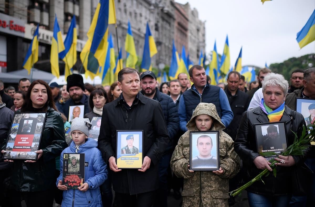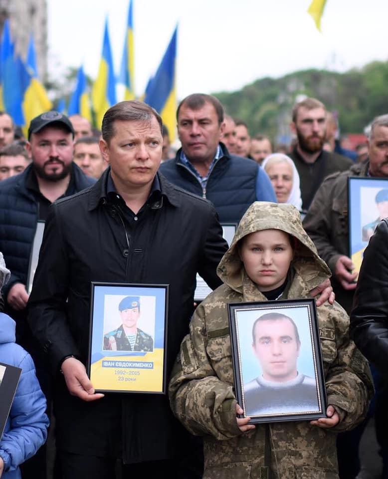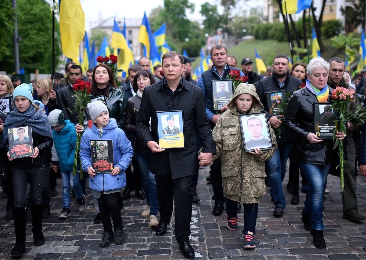 Війна на Сході України почалася з розстрілів на Майдані, вважає Олег Ляшко. Тому учасники громадської акції «Український безсмертний полк» після вшанування пам’яті загиблих Героїв Другої світової і війни на Донбасі рушили до Алеї Героїв Небесної Сотні. На чолі колони разом з Олегом Ляшком стояли діти з портретами загиблих на війні батьків.