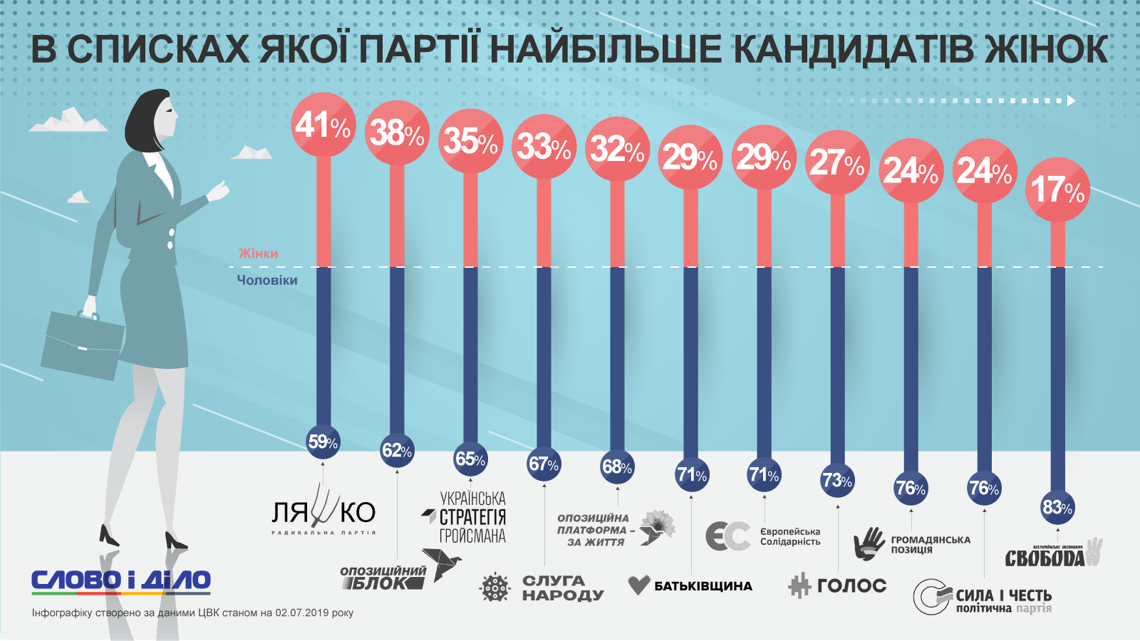 "Слово і Діло" проаналізувало списки партій, оприлюднені на сайті Центральної виборчої комісії. З'ясувалося, що найбільше кандидатів-жінок - в Радикальній партії Олега Ляшка, 41%. У "Опозиційному блоці" жінки складають 38% списку, в "Українській стратегії" Володимира Гройсмана – 35%. Найменше представниць чарівної статі в "Громадянській позиції" - 24%, в партії "Сила і Честь" - теж 24% і у "Свободі" - 17%.