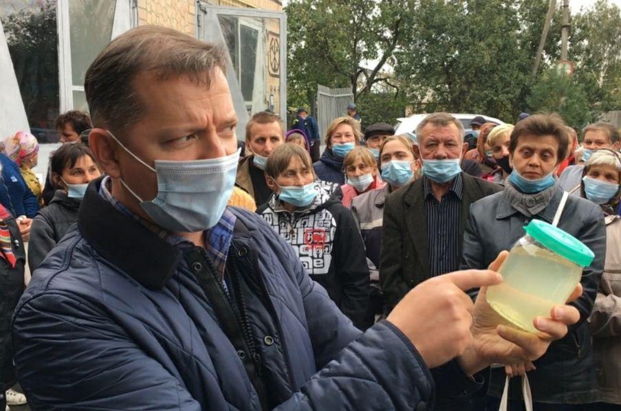 Мешканці Мени на Чернігівщині принесли на зустріч із Олегом Ляшком півлітрову банку води, яку набрали з-під крану у себе вдома. Її вміст обурив політика. Каже, в такій воді навіть митися страшно.