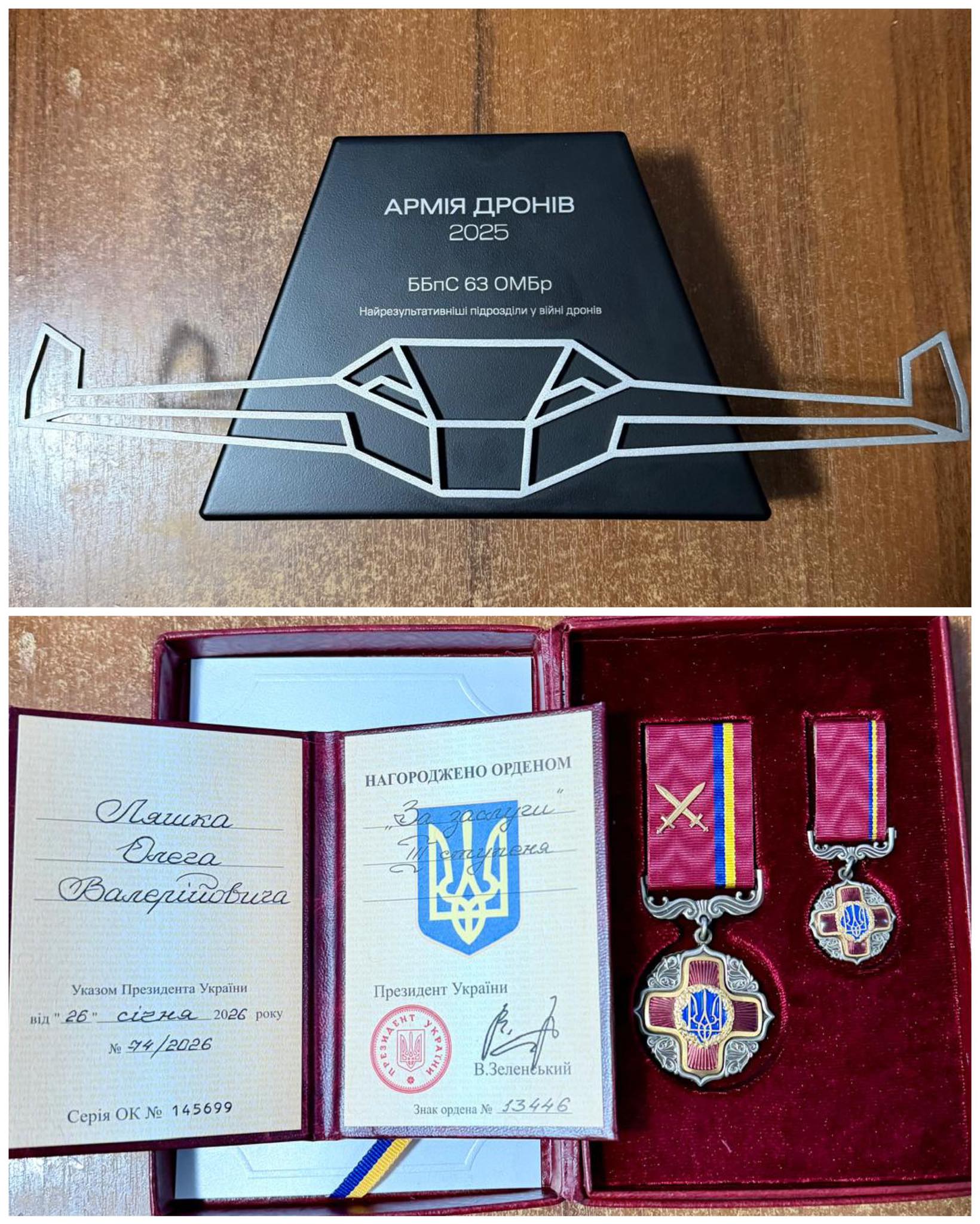 Крім того, міністр оборони України Михайло Федоров вручив відзнаку батальйону безпілотних систем 63-ї ОМБр. За підсумками 2025 року підрозділ увійшов до п’ятірки найкращих у Силах оборони України за кількістю знищених ворогів.